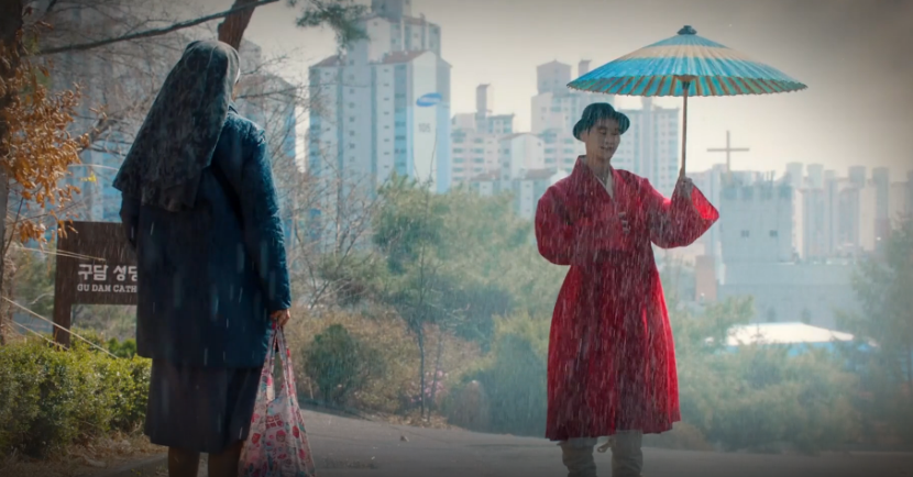 수녀앞에 나타난 빨강색 한복읜 남자...