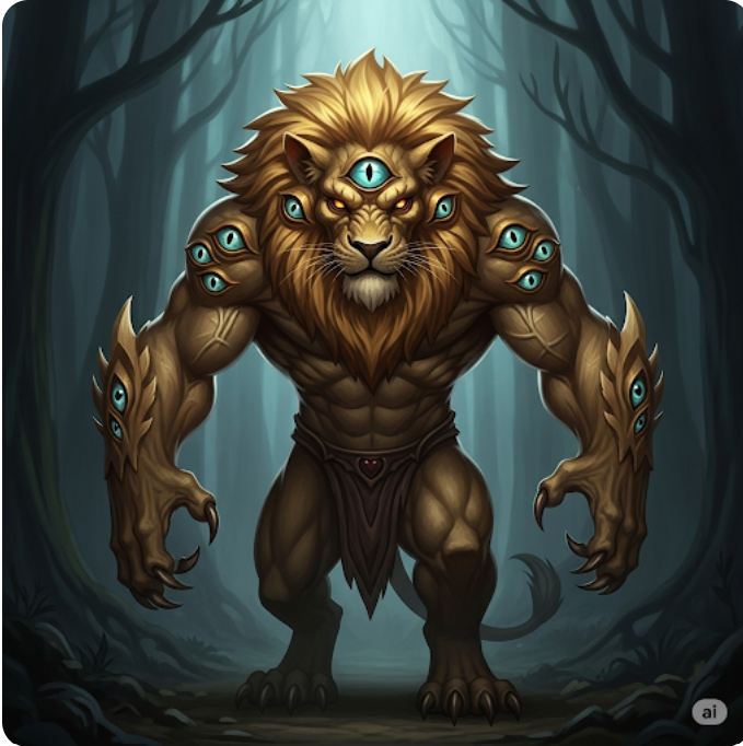 중국 고문헌에서 묘사되는 원형에 가까운 백택은 '사자의 형상에 눈이 여덟 개'인 모습으로 나타납니다. 용맹과 위엄의 상징인 사자의 몸을 가졌다는 것은 그가 다른 요괴들을 압도하는 강력한 신수임을 시각적으로 보여줍니다. 가장 큰 특징인 '여덟 개의 눈'은 물리적인 시력을 넘어선 전지전능한 통찰력을 상징합니다. 동서남북 사방(四方)과 그 사이인 사우(四隅)까지 팔방(八方)을 모두 볼 수 있다는 의미로, 세상의 그 어떤 것도 백택의 시야를 벗어날 수 없음을 나타냅니다. 이는 천지간의 모든 귀신을 꿰뚫어 보는 그의 능력을 형상화한 것입니다.