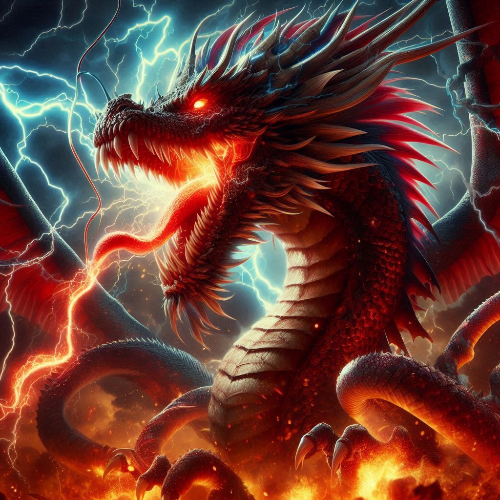 생김새는 거대하고 위협적입니다. 천 척(약 300미터 이상)의 키는 산처럼 크며, 몸 전체가 붉은 비늘로 덮여 불타는 듯합니다. 눈은 번개처럼 빛나 번쩍이며, 혀는 핏빛으로 길게 늘어져 있습니다. 갈기는 불길처럼 휘날려 폭풍을 연상시킵니다. 이는 용의 전형적 묘사로, 뱀 같은 몸에 사슴뿔, 매 눈, 잉어 비늘 등을 결합한 것입니다.