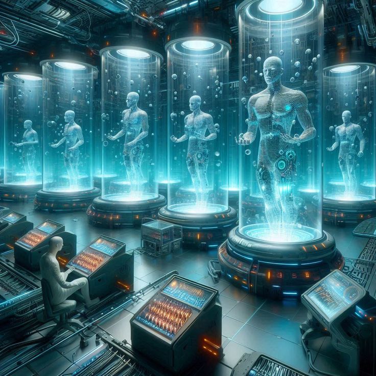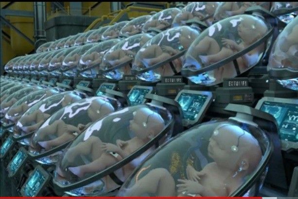 거대한 무인 공장에서 대규모로 배양되고 사육되고 있는 태아 및 신생아들, 그리고 각각의 상태를 체크하는 관리 로봇들의 모습.