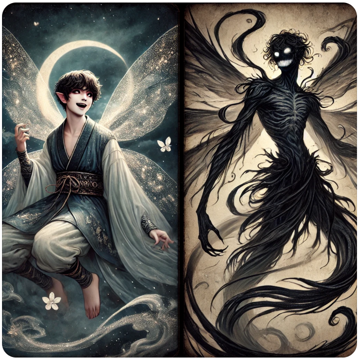 여기 어둑시니와 그슨대를 남성 형태로 표현한 이미지입니다. 어둑시니는 장난스러운 요정 같은 분위기를, 그슨대는 위압적이고 사악한 존재감을 강조했습니다.