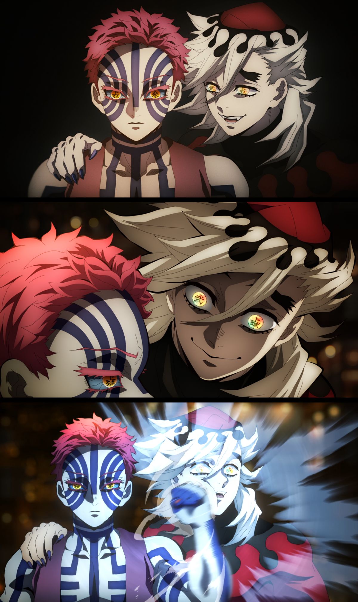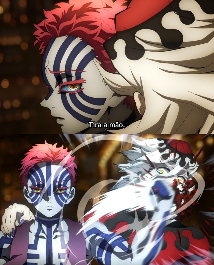 Douma regards Akaza, who dislikes him, as a 'friend' and approaches him in a friendly manner. However, Akaza harbors intense hostility toward Douma and expresses these feelings through physical means. From Akaza's perspective, Douma is someone he can never like because he has usurped his Upper Rank, specifically the position of Upper Rank 6. Due to his innate lack of social skills and obliviousness, Douma has repeatedly committed acts that earned him Akaza's hatred. For instance, Douma spoke to Akaza in a familiar manner and even jokingly called him a 'friend,' but this attitude only served to constantly irritate Akaza.