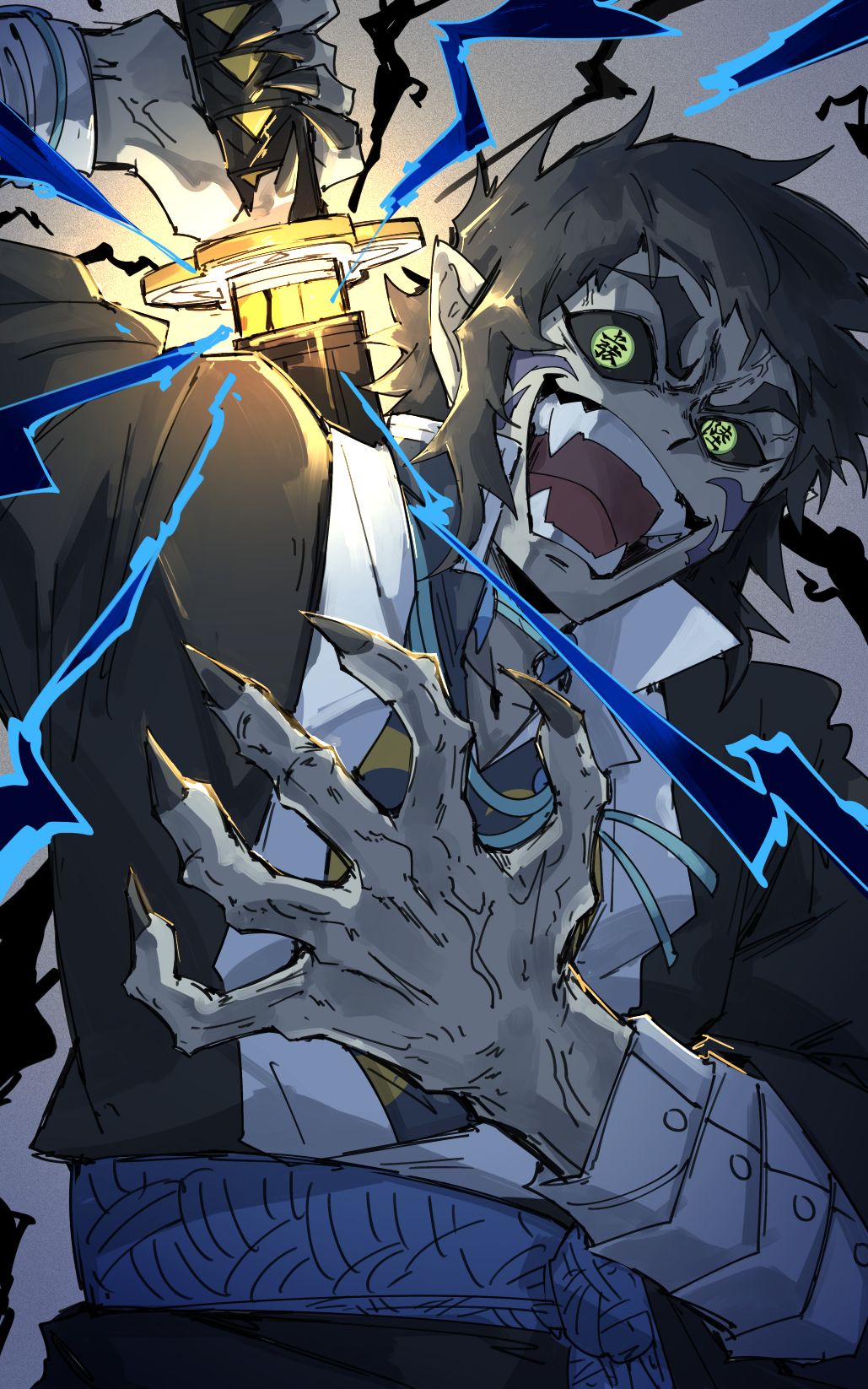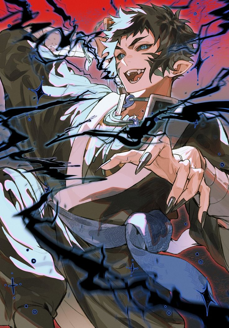 In the Infinity Arc, Kaigaku reappears as a Blood Demon. As a Blood Demon, he underwent a symbolic transformation, completely different from his original human form: pale skin, sharp black claws, pointed ears, turquoise-colored eyes, and the Blood Demon emblem emblazoned on both cheeks. As a Blood Demon, he wore a black haori over his old Daewon uniform and wielded a uniquely crafted six-sword sword based on his own body. This sword features a dark gold blade on a black background, and is engraved with the Blood Demon Art's Hamon symbol, symbolizing a black thunderbolt. This symbolizes his evolution from the Nichirin sword he wielded as a human, but with a far more powerful and brutal force.
