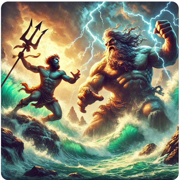 몸집이 작은 바다의 신 포세이돈과 커다란 거인 폴리보테스와 전투