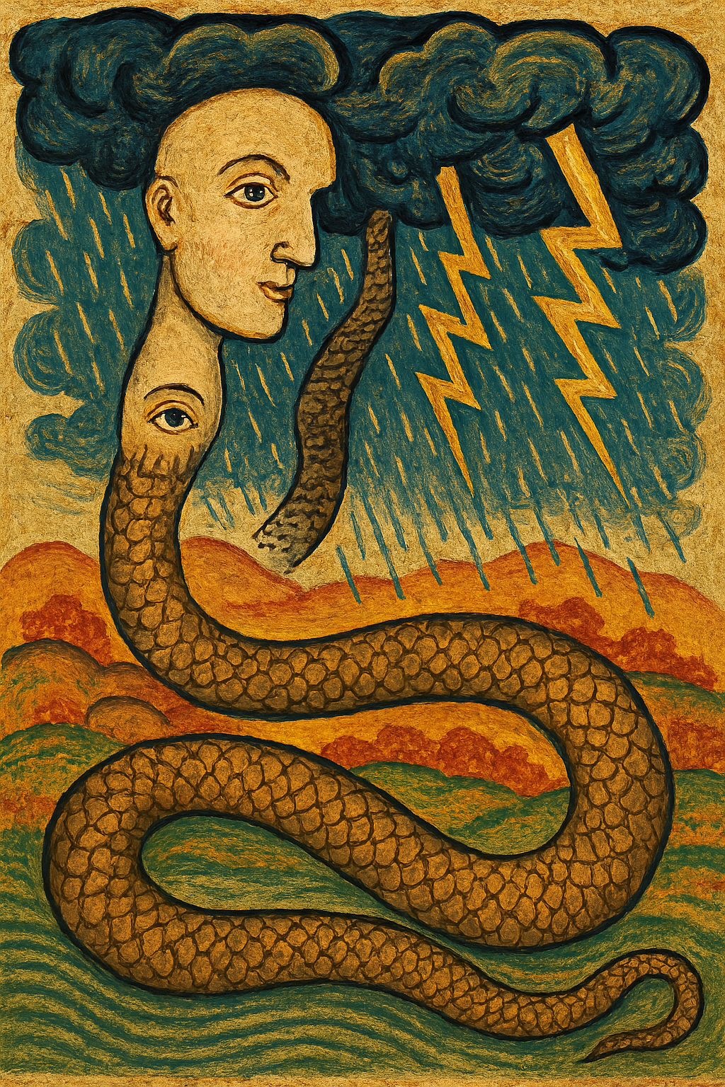 가장 독특한 외모적 특징 중 하나는 '두 개의 눈이 아래위로 나 있다'는 점입니다. 일반적인 생물의 눈은 좌우로 위치하지만, 촉룡은 수직적으로 눈이 배치되어 있습니다. 이 기이한 눈의 구조는 촉룡이 세상을 다른 차원에서 바라보는 존재이거나, 혹은 특별한 시각 능력과 통찰력을 지니고 있음을 암시합니다. 또한 이 눈이 '낮과 밤'을 만드는 핵심적인 기관임을 고려할 때, 상하로 나뉜 눈은 하늘과 땅, 혹은 어둠과 빛의 양극을 동시에 바라보며 통제하는 촉룡의 권능을 상징적으로 보여준다고 해석할 수 있습니다.
