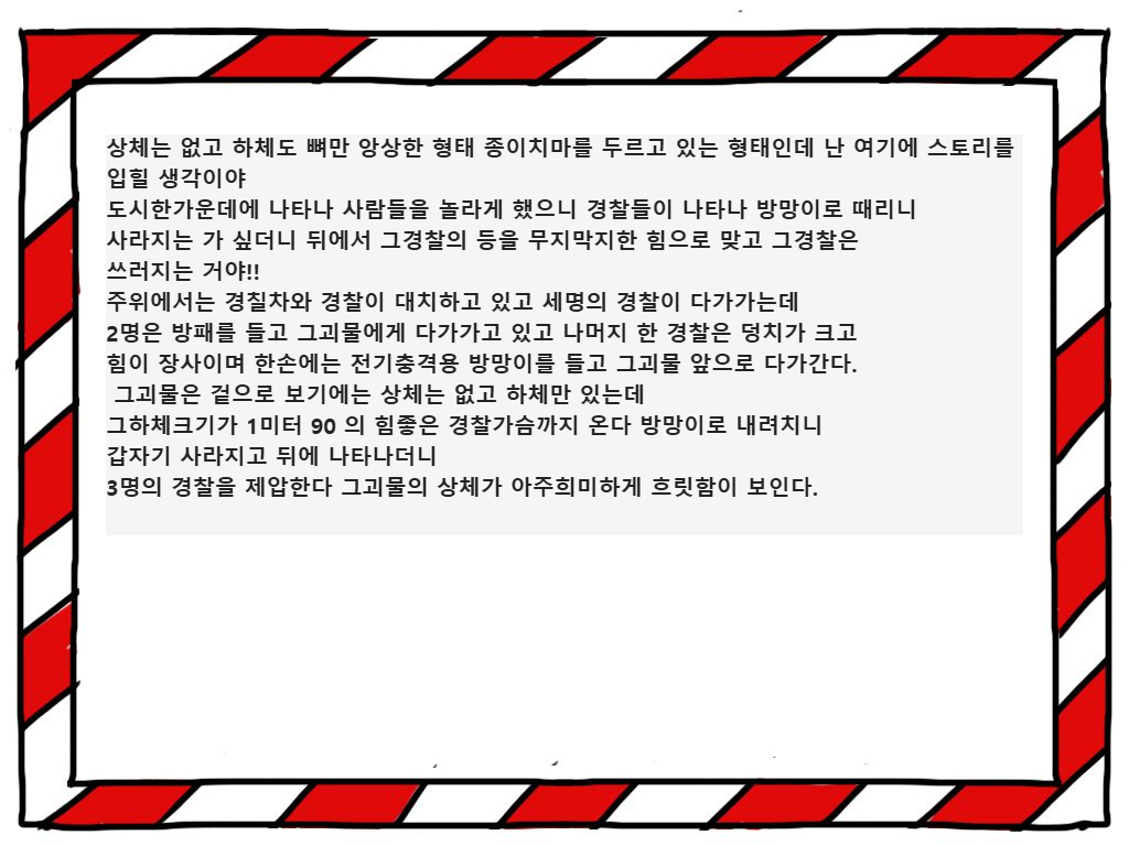 2장면 관련 프롬프트 내용과 생성 사진입니다. ---> “경찰이 방망이로 내리치자 괴물이 사라짐.”