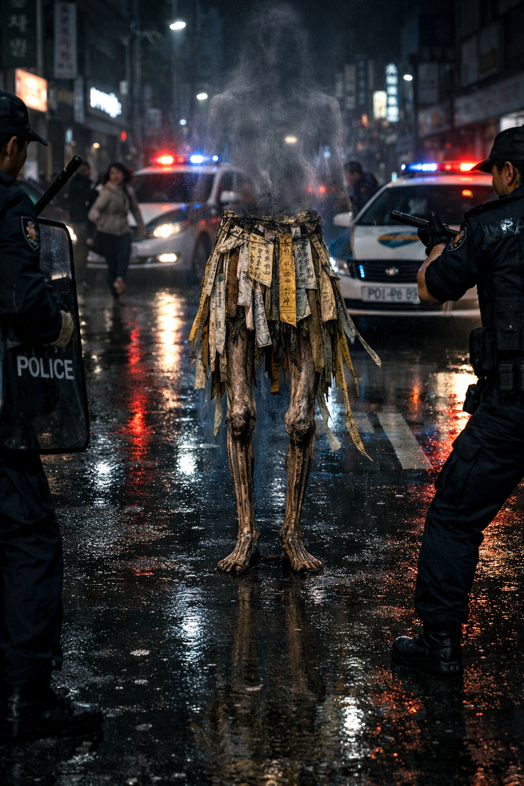 no upper body, only a pair of emaciated skeletal legs, dry bone-like legs with almost no flesh, wearing a torn skirt made of old ritual paper and white-yellow paper strips, faint blurry ghostly upper torso barely visible like a transparent afterimage, eerie Korean urban street at night, wet asphalt reflecting police sirens, surrounded by Korean police cars and police officers, cinematic horror realism, dark atmosphere, unsettling presence, highly detailed, realistic lighting, ominous, disturbing, serious tone, no comedy, no cartoon, no cute style, vertical composition, 9:16, in the center of a modern Korean city street, startled civilians fleeing in the background, multiple police cars forming a perimeter, red and blue emergency lights flashing, several Korean police officers aiming batons and shields toward the creature, the monster stands motionless in the middle of the road, tense confrontation, dramatic wide shot, terrifying silence before violence