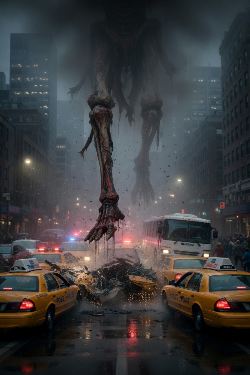 주요 변경점:거대한 괴물 다리뼈가 도로에 착지하면서 일으킨 강한 충격으로 주변 택시들이 심하게 부서지고 폭발하는 장면 유지