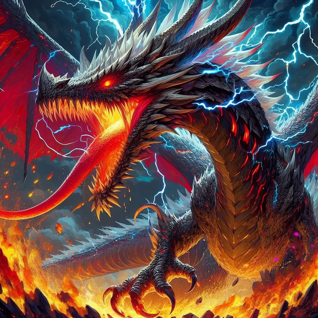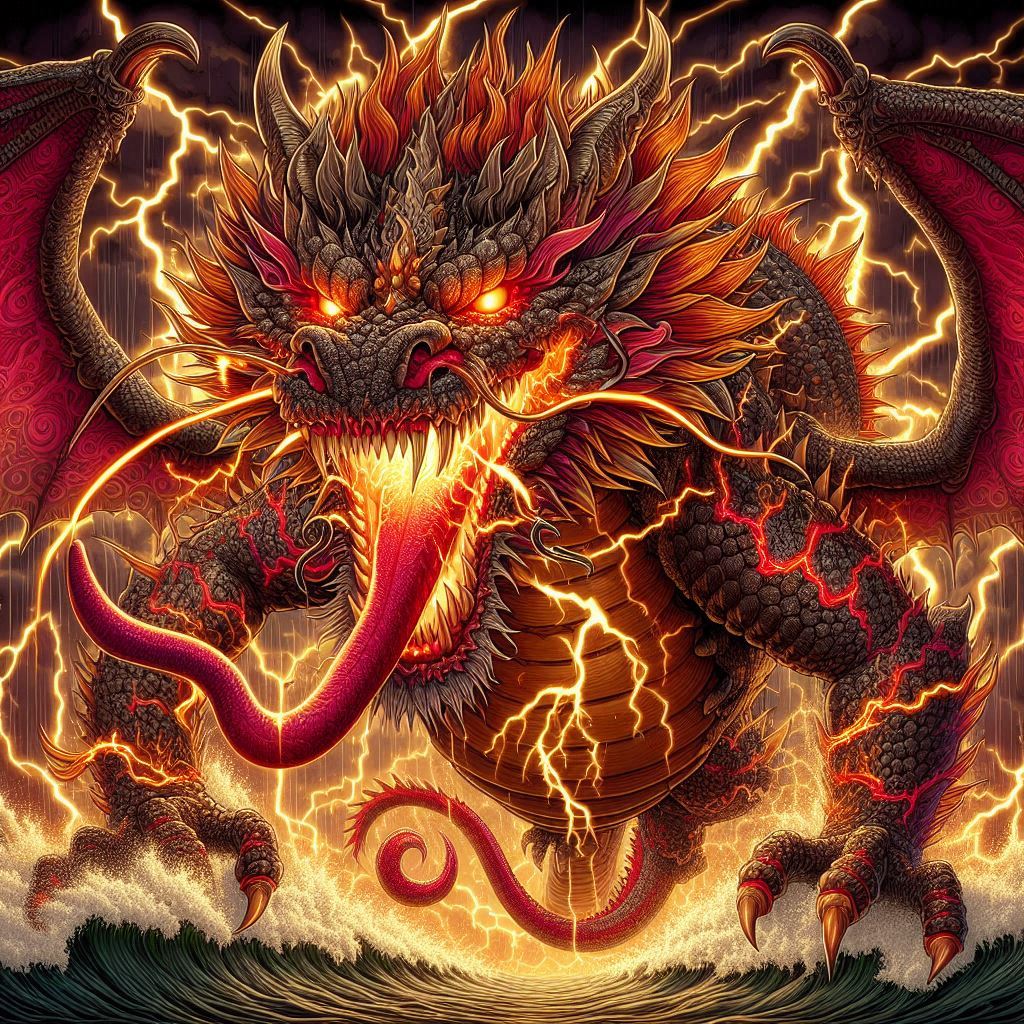 생김새는 거대하고 위협적입니다. 천 척(약 300미터 이상)의 키는 산처럼 크며, 몸 전체가 붉은 비늘로 덮여 불타는 듯합니다. 눈은 번개처럼 빛나 번쩍이며, 혀는 핏빛으로 길게 늘어져 있습니다. 갈기는 불길처럼 휘날려 폭풍을 연상시킵니다. 이는 용의 전형적 묘사로, 뱀 같은 몸에 사슴뿔, 매 눈, 잉어 비늘 등을 결합한 것입니다.