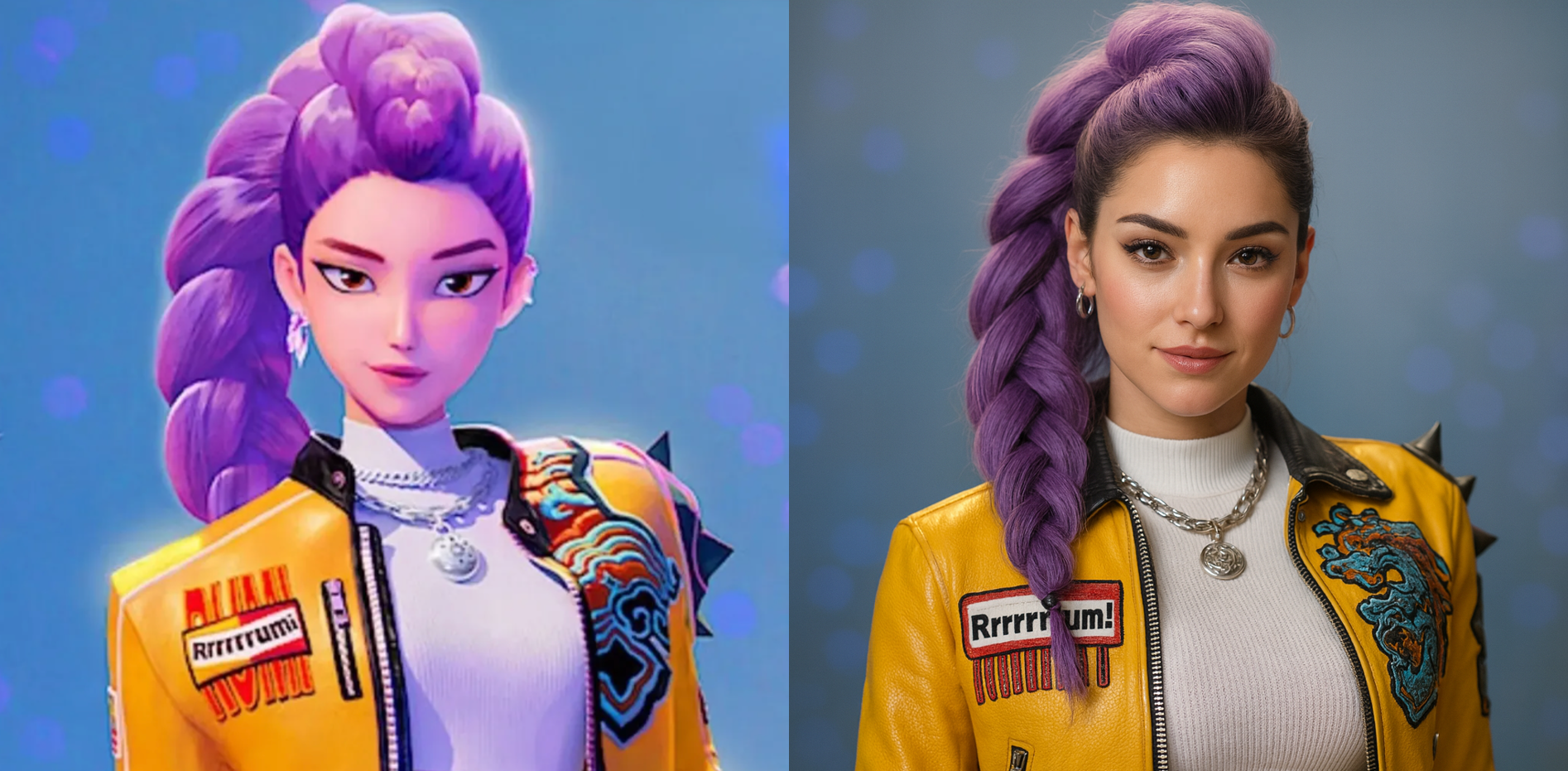 루미의 외모는 그녀의 독특한 헤어스타일과 긴 머리카락이 두드러지는 특징을 가지고 있습니다. 다른 헌트릭스 멤버들의 머리 길이도 긴 편이지만, 루미는 그중에서도 독보적으로 머리카락이 길어 평소에는 후드를 눌러 써서 머리를 완전히 가리고 다닙니다 . 땋은 머리 상태에서도 무릎 아래, 거의 발목 위까지 내려올 정도로 길다고 묘사되는데, 이를 풀어놓으면 땅에 닿을 정도라고 하니 그 길이가 상상을 초월합니다 . 이러한 특유의 떠꺼머리 헤어스타일은 친어머니인 류미영을 거의 그대로 빼닮은 것이라고 합니다 . 하지만 어머니가 꽁지머리 형태였던 것과 달리, 루미는 앞머리까지 모두 정리하여 머리 전체를 땋은 형태를 취하고 있습니다 . 이러한 긴 머리는 그녀의 강인하면서도 신비로운 이미지를 부각하며, 헌터로서의 활동 시에도 역동적인 움직임을 더욱 돋보이게 하는 요소가 됩니다.
