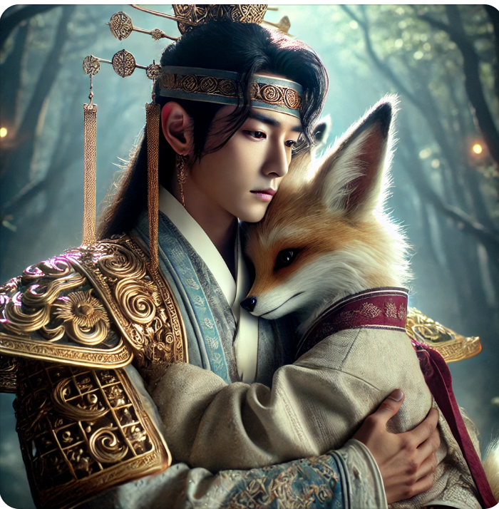 여기 비형랑이 길달을 따뜻하게 안으며 깊은 애정을 표현하는 장면입니다. 두 존재 사이의 강한 유대감과 보호하려는 마음이 잘 담겨 있네요! 💖