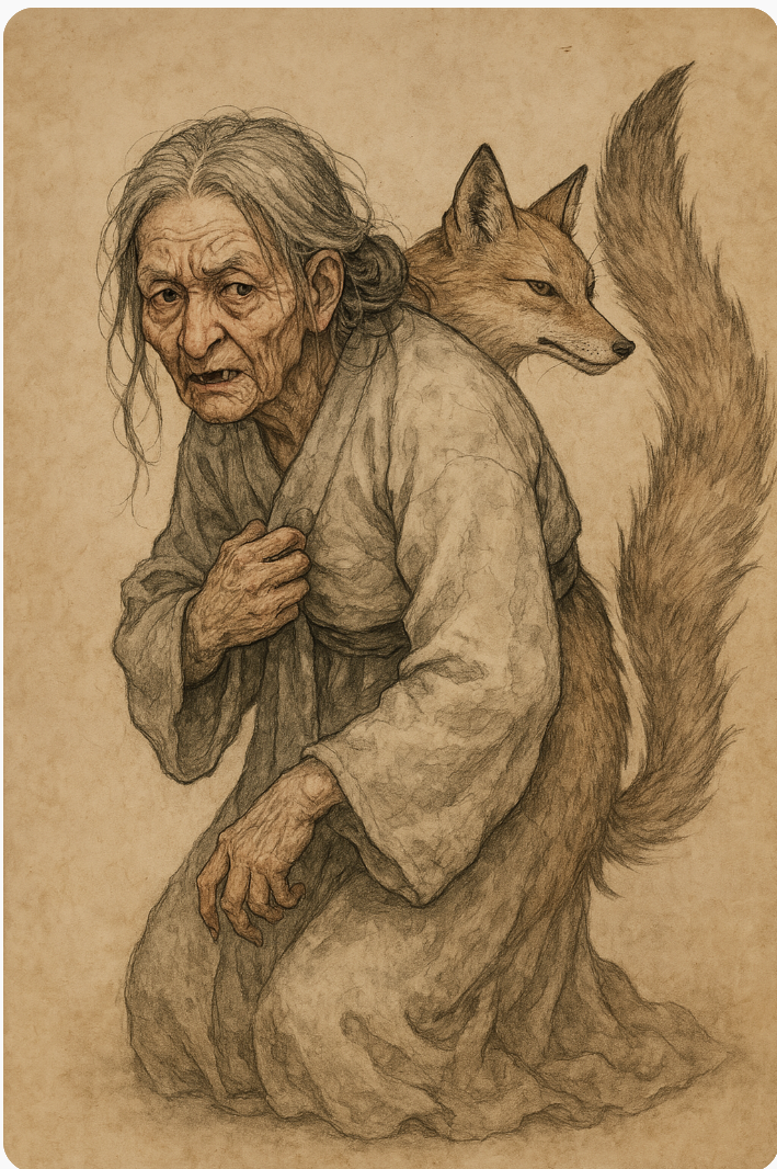 이 기록을 보면 ‘老嫗化狐’는 단순히 ‘노파가 여우로 변했다’는 뜻이지, 특정한 요괴의 이름을 가리키는 단어로 사용된 것이 아닙니다. 만약 특정 요괴의 이름이었다면 ‘化狐’(여우로 변하다) 같은 동작을 포함한 표현 대신, 고유명사 형태로 나타났을 가능성이 큽니다.